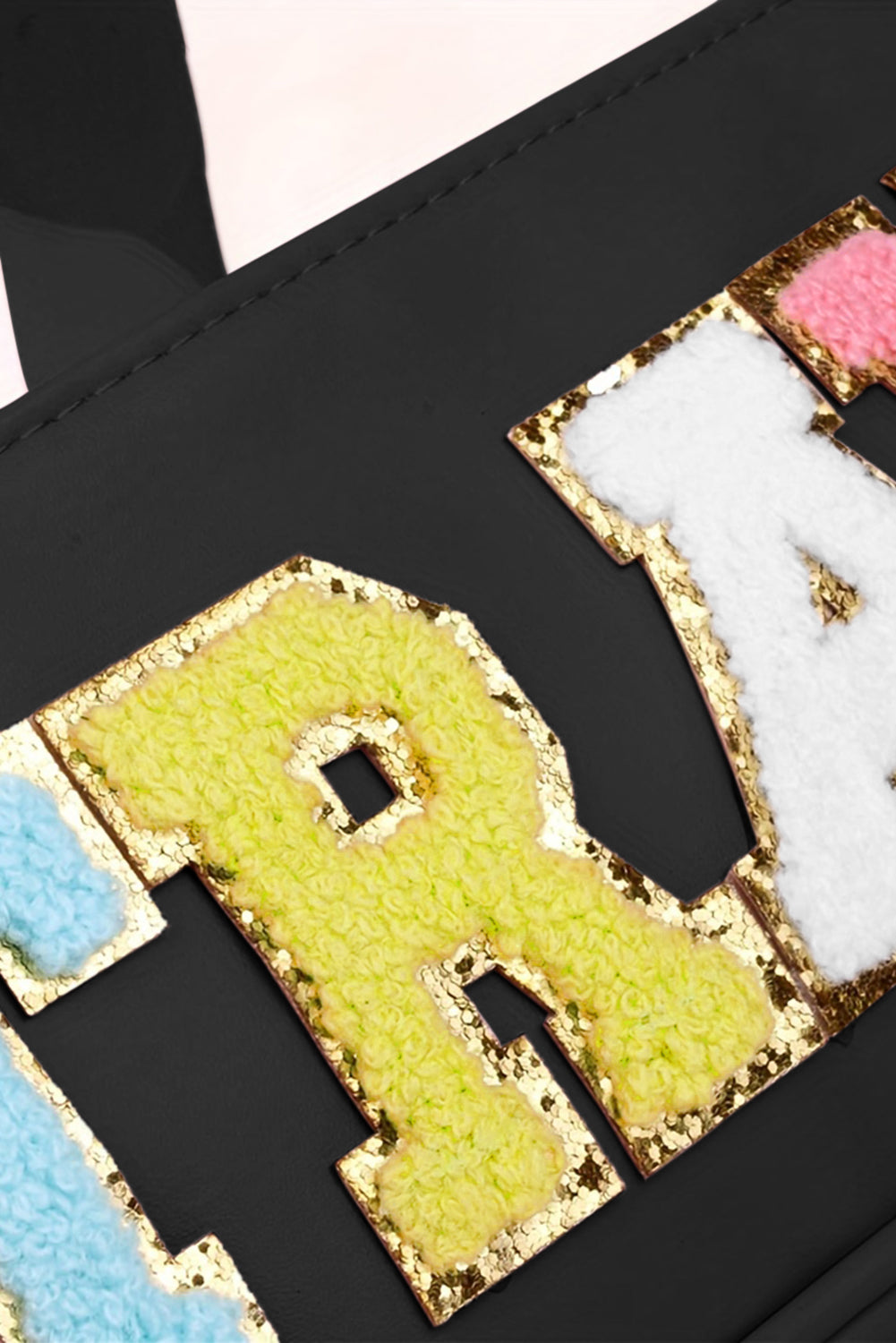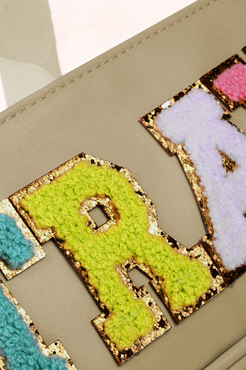 - The chenille letter detail on the front of the bag adds a trendy and playful element.