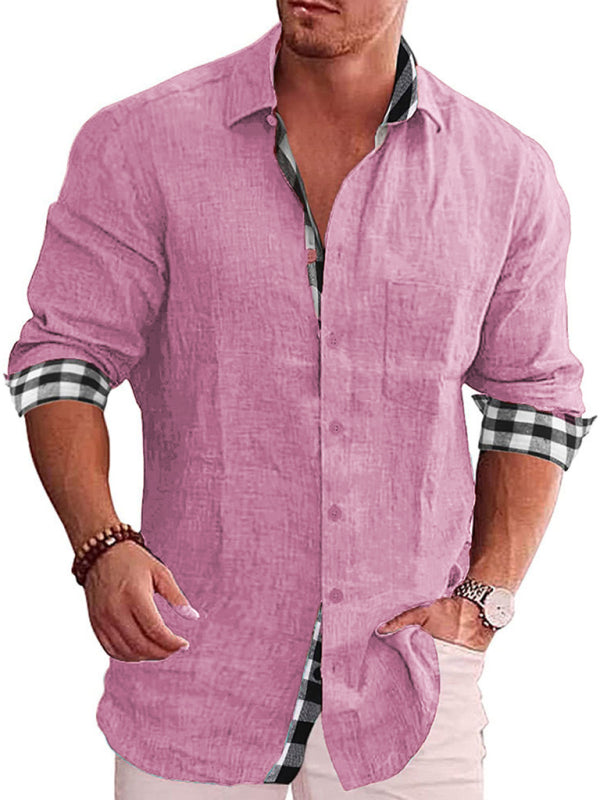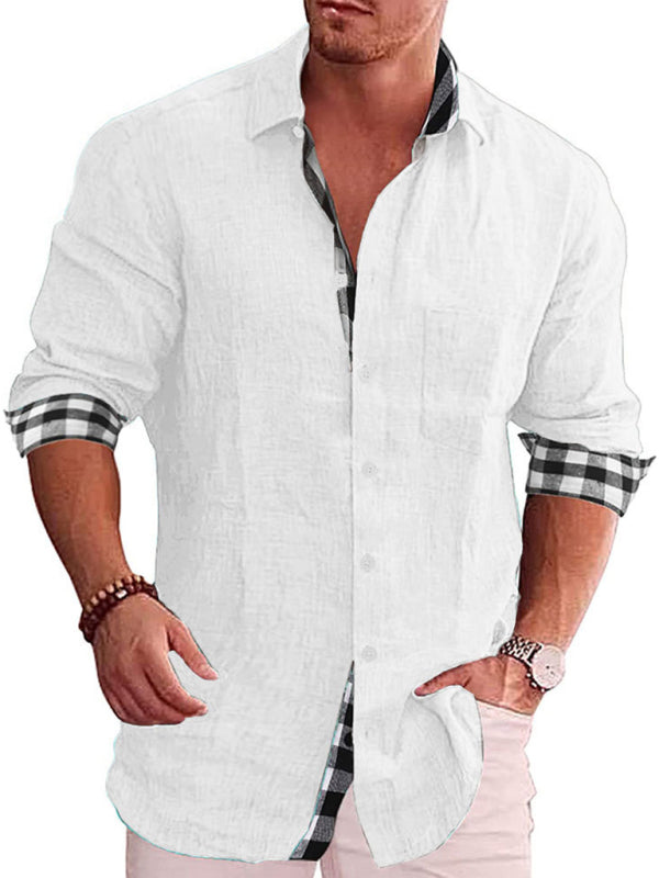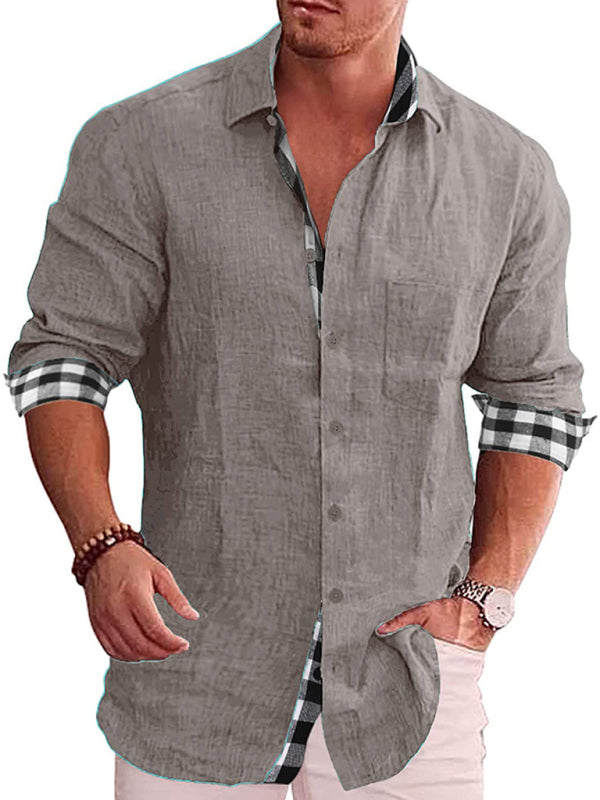Casual Cotton Linen Shirt Men's Long Sleeve Plaid Stitching Shirt
