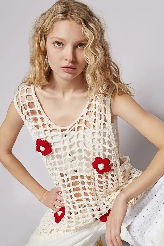 POL Flower Crochet Scoop Neck Sleeveless Knit Cover Up