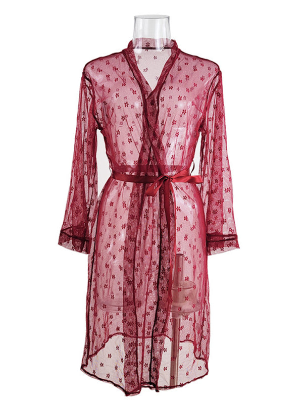 Women's sexy mesh see-through pajamas four-piece long coat bra underwear set